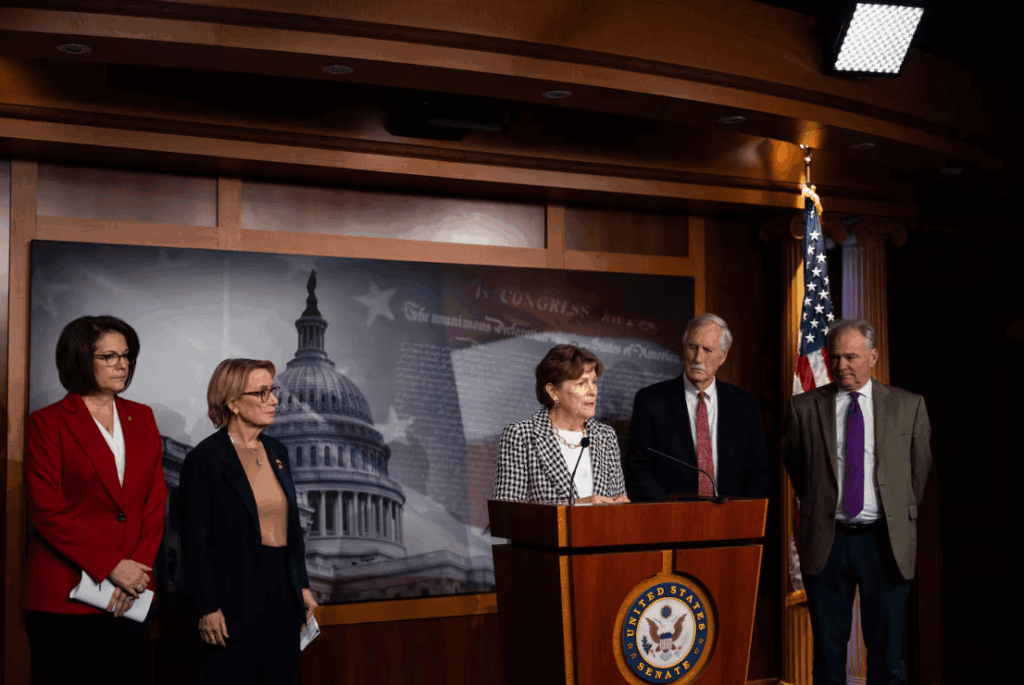 Senator Jeanne Shaheen, a New Hampshire Democrat (center), was joined by fellow senators (from left) Catherine Cortez Masto of Nevada, Maggie Hassan of New Hampshire, Angus King of Maine, and Tim Kaine of Virginia, as she spoke at a news conference on Capitol Hill on Sunday to explain why they voted with Republicans to advance legislation to end the government shutdown.TIERNEY L. CROSS/NYT