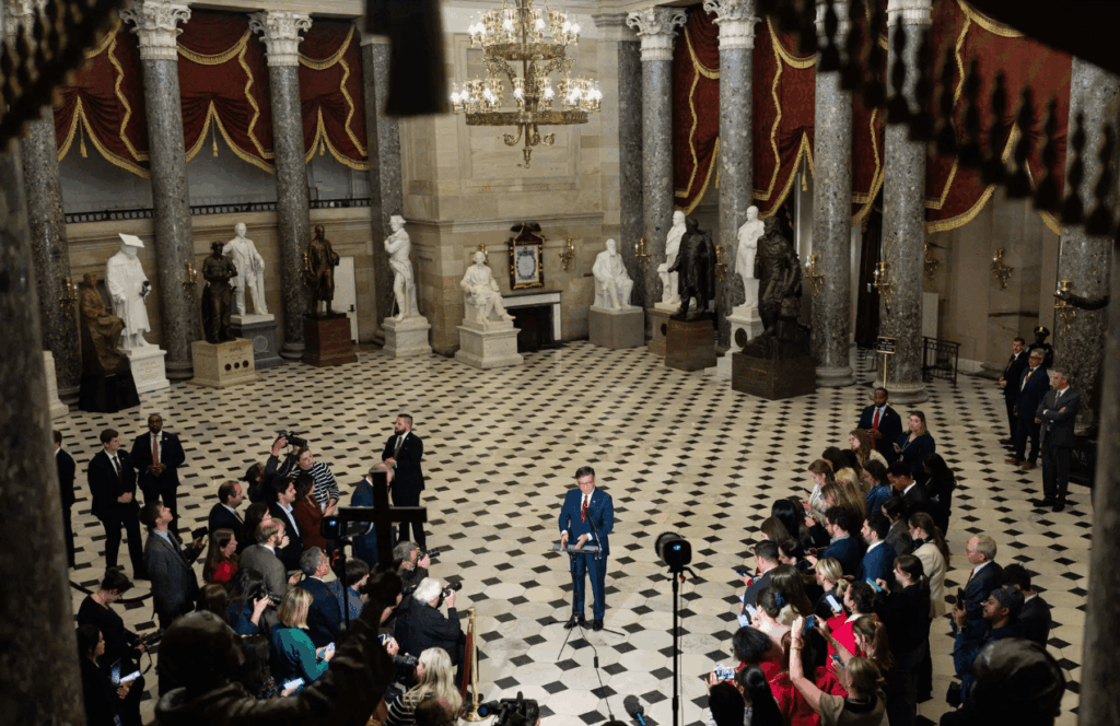 题图:众议院议长迈克·约翰逊在众议院周三通过一项结束政府停摆的法案后举行的新闻发布会上发表了讲话。(图片来源:Tierney L. Cross/《纽约时报》)