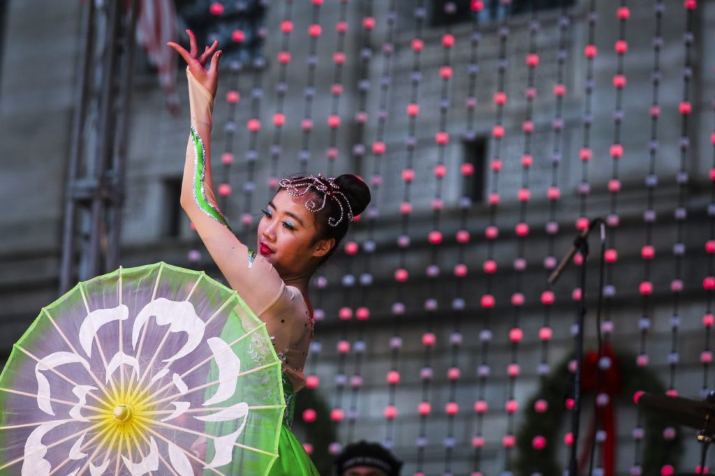 图片:来自大波士顿华人文化协会的舞者在科普利广场的舞台上表演。(ERIN CLARK/GLOBE STAFF)