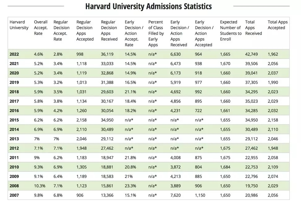 哈佛大学在过去15年里,每年的大一新生人数都稳定在1650人到1670人左右/图片来源:Ivy Coach