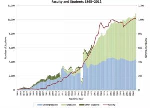 我自己所任教的大学,麻省理工学院,2022届大一新生1120人,2008届大一新生为1077人,而1980届大一新生则为1109人。在麻省理工学院2012的年度学校报告中,校方公布了1865年到2012年每年的本科入学人数(见下图蓝色部分)。不可思议的是,麻省理工学院本科录取人数的高峰是在上世纪七十年代。 一个以科技为主的大学在这个科技黄金时代为社会培养的人才数目是在下降的!