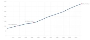 美国顶尖大学本科应该进行扩招的一个很简单和直接的原因就是美国人口的增长。根据美国统计局的数据,美国人口数量在二战后一直匀速稳步上升。上世纪八十年代初期,美国人口数量约为2.25亿人,而到了2018年,美国人口约为3.29亿人,涨幅约为46%。