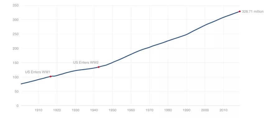二战之后,美国人口数量保持匀速增加/图片来源:美国统计局