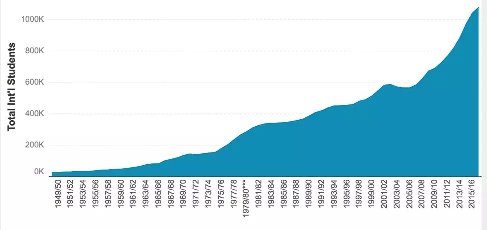 从上世纪70年代中期开始,在美国际学生数量一直在快速增长/图片来源:2017年国际教育开放报告