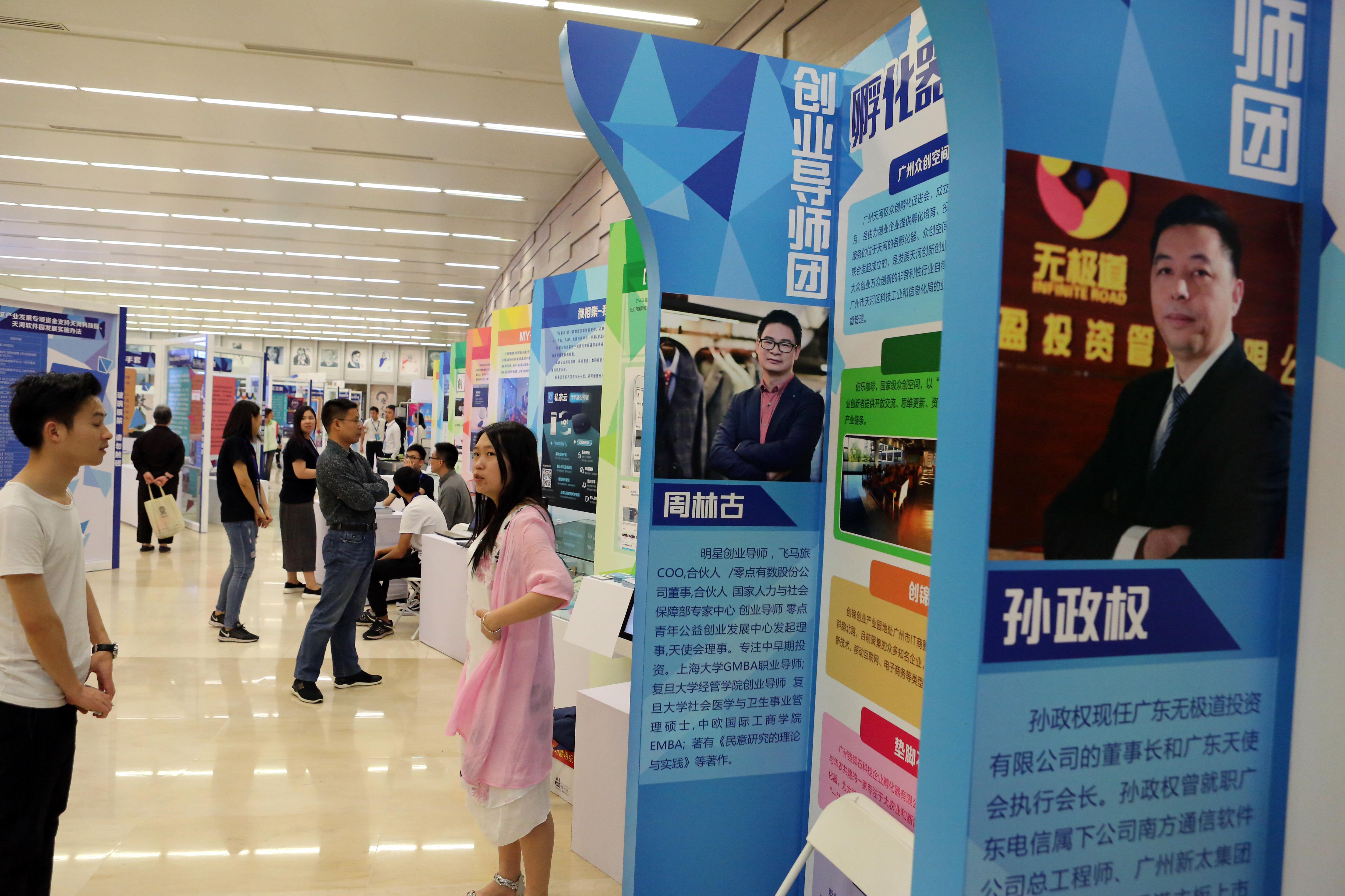会场外展示着各种创业公司和团队的创新产品及介绍栏。 刘力勤 摄