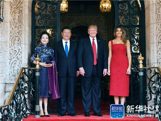 图:2017年4月6日,习近平在美国佛罗里达州海湖庄园同美国总统特朗普举行中美元首会晤。这是习近平和夫人彭丽媛同特朗普和夫人梅拉尼娅合影留念。新华社记者 饶爱民 摄