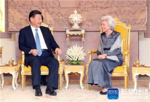 图:2016年10月13日,习近平在金边看望柬埔寨太后莫尼列。莫尼列太后特意请习近平在西哈努克太皇生前常坐的椅子上就座。新华社记者 姚大伟 摄