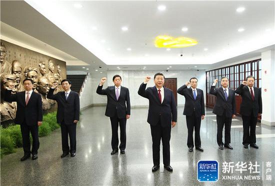 图:2017年10月31日上午,习近平带领其他中共中央政治局常委同志在上海中共一大会址纪念馆一起重温入党誓词。新华社记者 兰红光 摄