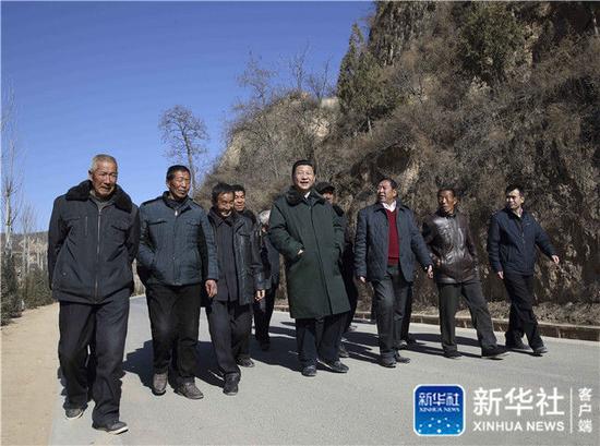 图:2015年2月13日上午,习近平在延安市延川县文安驿镇梁家河村调研时同村民边走边聊。新华社记者 兰红光 摄