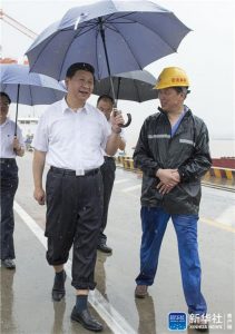 图:2013年7月21日上午,习近平冒雨来到武汉新港阳逻集装箱港区考察。新华社记者 李学仁 摄