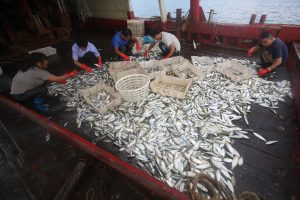 深圳大鹏新区的渔民们正在按照鱼的品种和大小来分筐。朱洪波 摄
