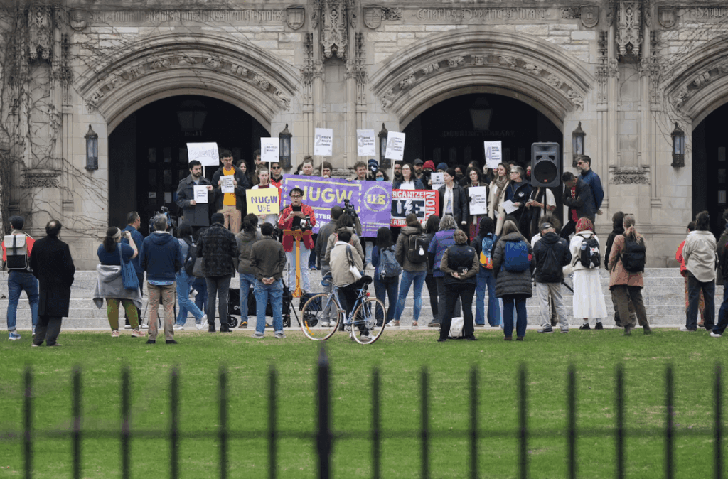 题图:四月,教育工作者、学生和工会成员出席了伊利诺伊州埃文斯顿西北大学与美国大学教授协会分会联合举办的西北大学研究生工人新闻发布会。Nam Y. Huh/美联社